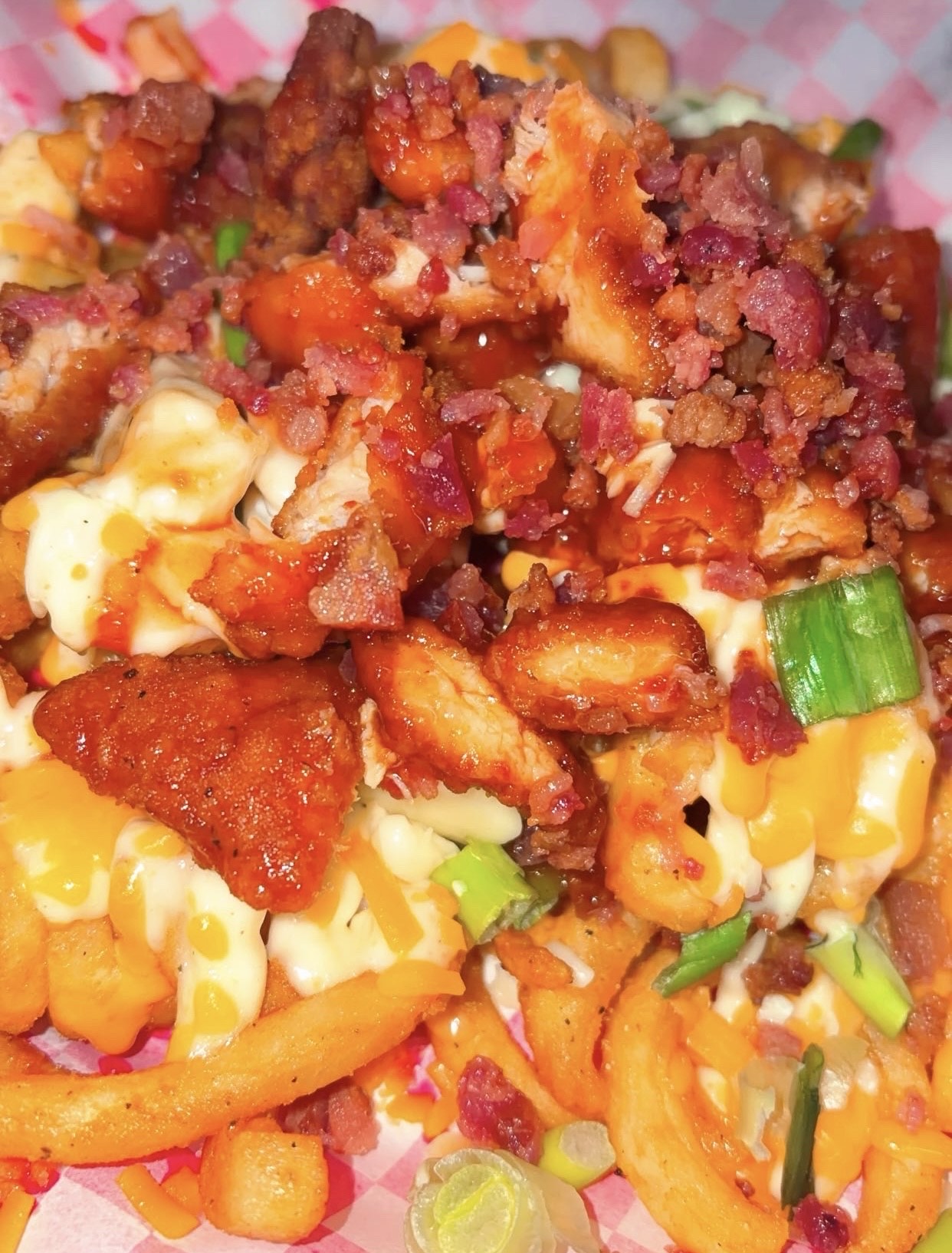 Check out our new poutine! Classic french fries and cheese curds, topped with buffalo chicken, bacon, cheddar, and a garnish of green onions, including a garlic aioli twist!